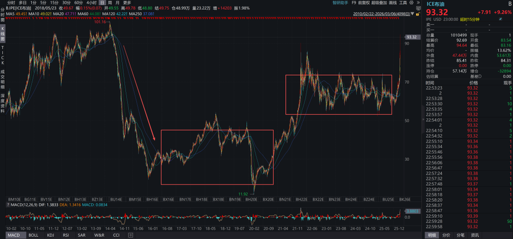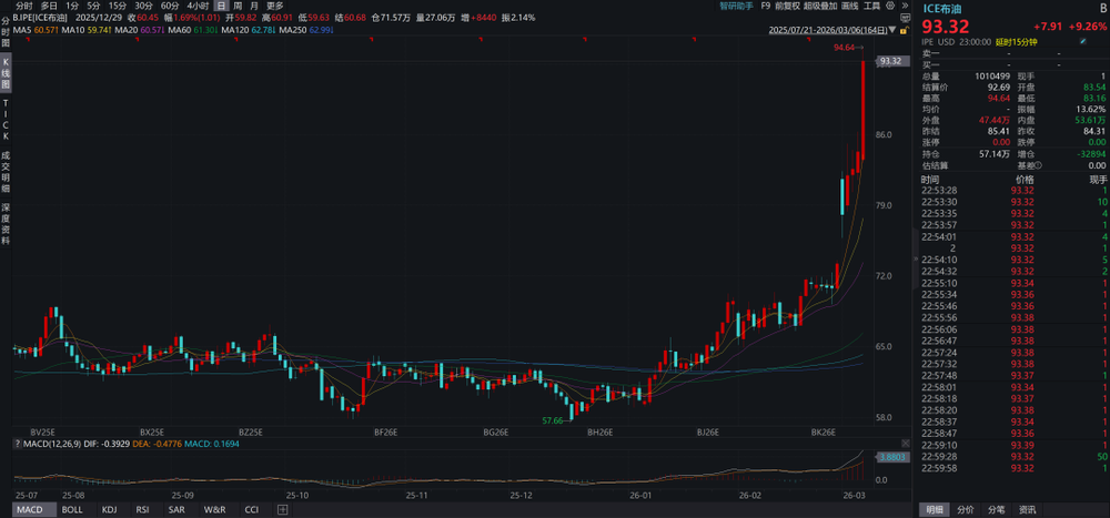 近期,美伊冲突持续,中东局势继续恶化,原油价格持续上涨。截至2026年3月6日,布油合约价格已经上涨到93.32美元/桶,今年以来的涨幅扩大到了55%+。