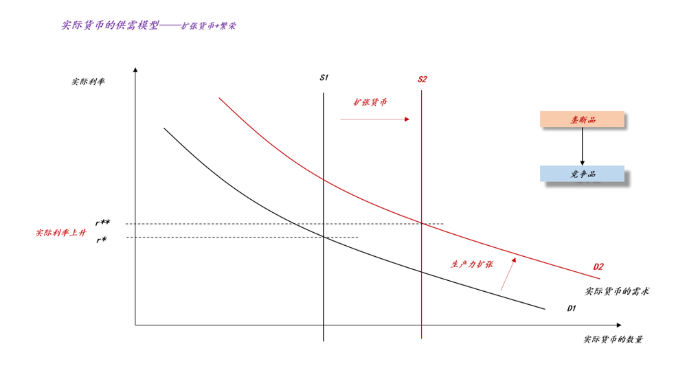 通过这个比喻,我们就能更加深刻地理解实际货币供给曲线和需求曲线的关系了:是供给曲线决定需求曲线,而不是相反,这是因为供给曲线背后是垄断品,而需求曲线背后是完全竞争品。