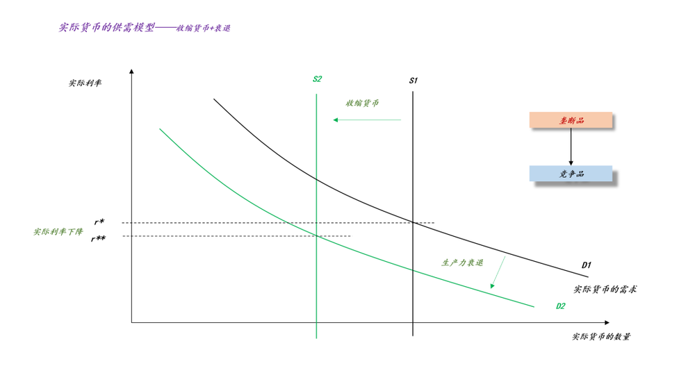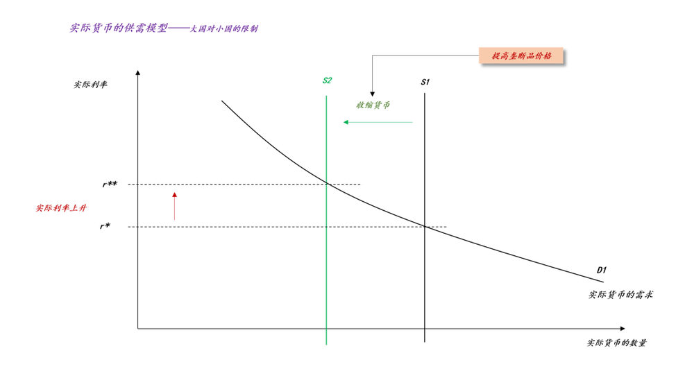 如上图所示,上图刻画了小国实际货币的供需曲线,它的实际货币供给曲线S=M/P,当超级大国大幅提高垄断要素价格时,小国的物价会快速上升,使得该国实际货币的供给曲线S收缩,从S1收缩至S2。这会推动该国实际利率上升,从r*上升至r**。