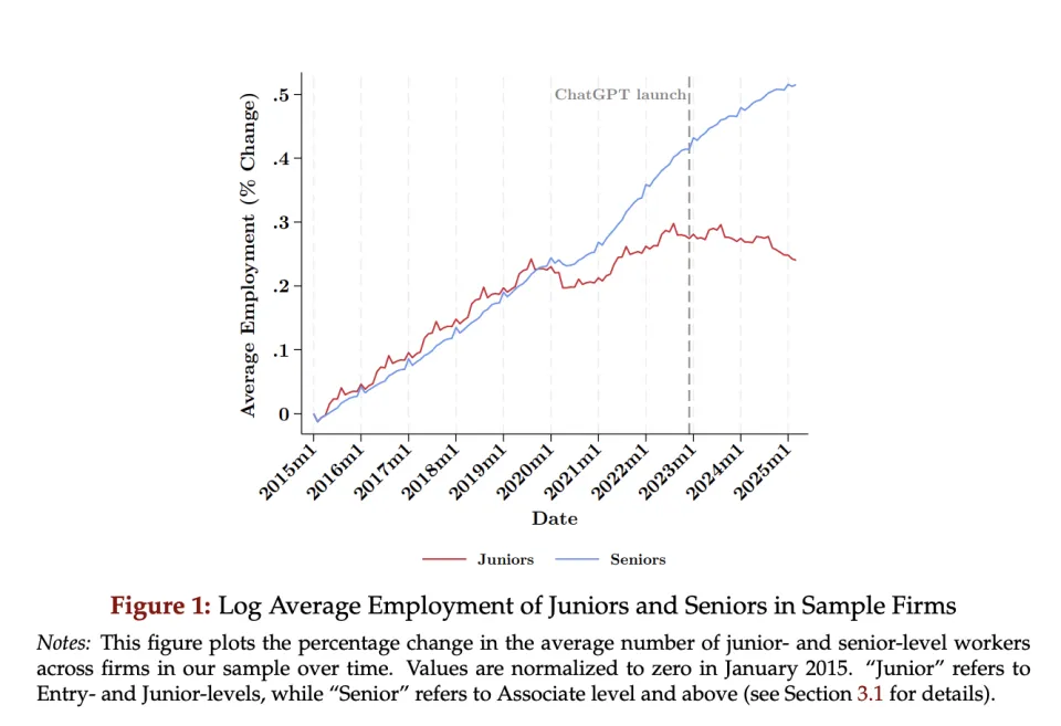 这不是裁员。这是一种更安静、更系统的排斥:企业不裁掉谁,只是不再招新人了。一个资深员工加上AI,就能完成过去需要五个初级员工干的活。企业甚至不需要解雇任何人——只要冻结招聘,让自然流失做完剩下的事。
