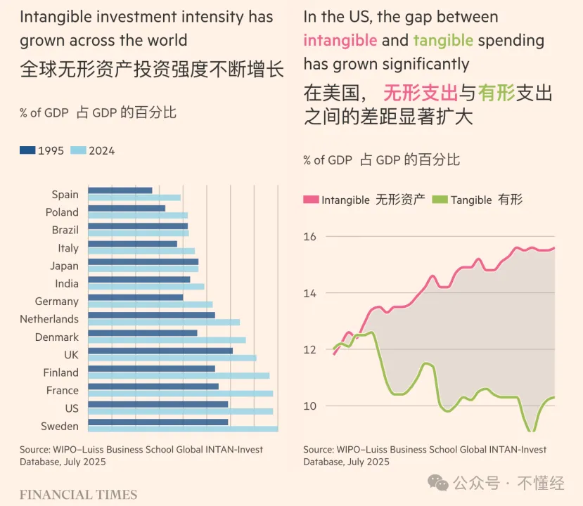 五十年前,标准普尔500指数公司的资产绝大多数是看得见、摸得着的物理实体——工厂、设备、库存。今天,据估算,这些公司约90%的资产是无形的:知识产权、品牌、网络效应、代码。