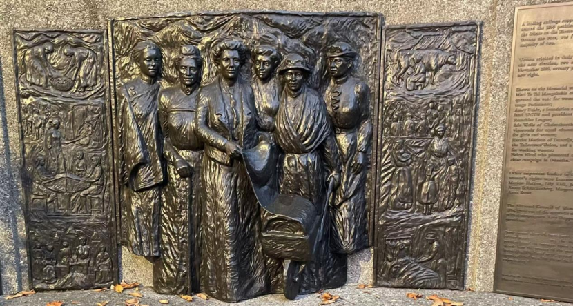 |纪念女权运动的浮雕矗立在新西兰南岛最大城市克莱斯特彻奇市中心,手持签名册的是谢泼德。
