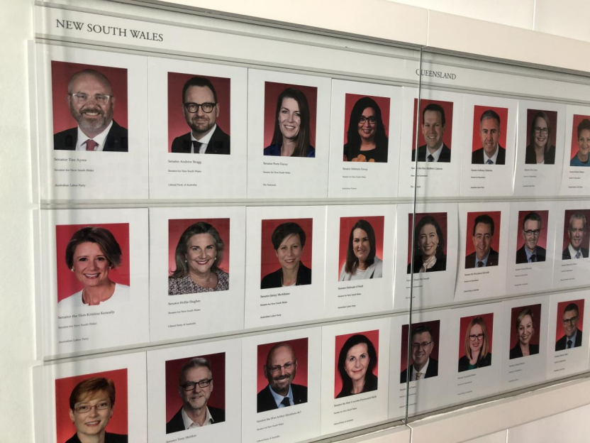 |新西兰议会大厦内禁止拍照,使用与新西兰女权势均力敌的澳大利亚的相关照片,同样能说明问题。图为澳大利亚议会大厦参议员介绍,没有提及性别,只有姓名、职务、所代表的州和党派。