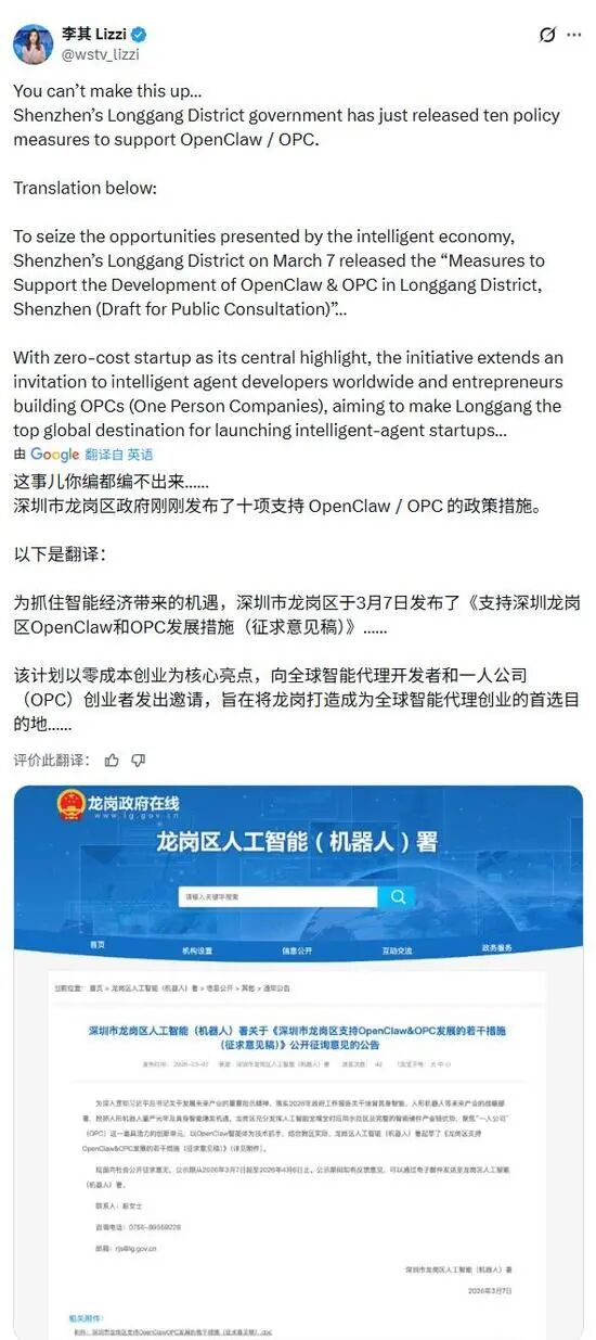 深圳龙岗区刚刚发布了一份重磅政策草案公开征求意见。核心内容就是明确鼓励专业平台提供免费的OpenClaw服务,同时给予应用开发真金白银的补贴,最高可达200万元。龙岗区去年就成立了全国首个AI与机器人局,这次官方亲自下场,就是想彻底把OpenClaw生态做大,鼎力支持一人公司模式的崛起。