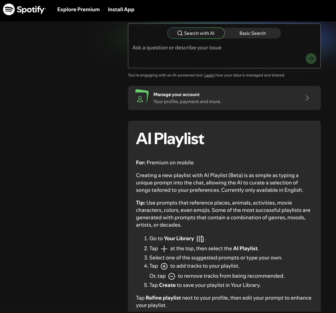 Spotify今年推出了AI功能,重点不是售卖一个新的AI歌手宇宙,而是给Premium用户提供“prompted playlist”——让用户用自然语言塑造自己的播放体验。