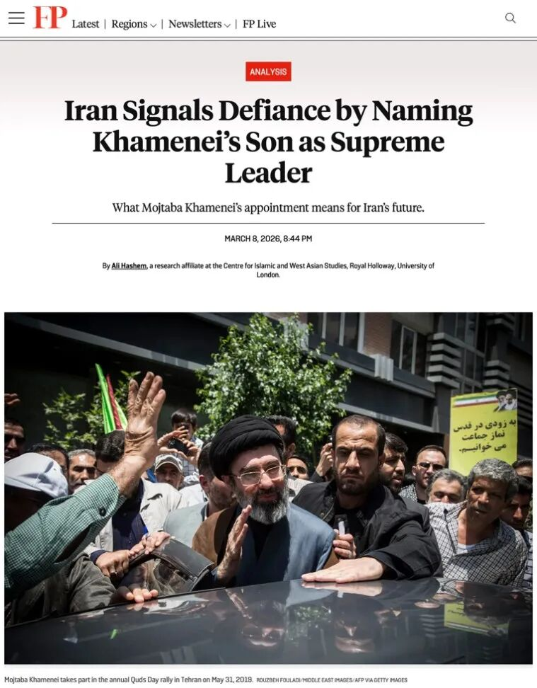 本文原载于《外交政策》(Foreign Policy),原题为“Iran Signals Defiance by Naming Khamenei’s Son as Supreme Leader”,囿于篇幅,有所删减,供读者参考。