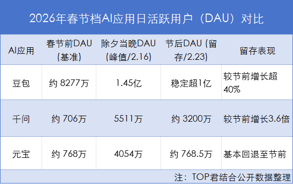 不过,还有一点值得注意,没有参加红包大战的DeepSeek春节前后日活稳定在2477.5万,与狂撒30亿补贴的千问处于同一量级。究其原因,DeepSeek凭借扎实的模型能力留住了真正使用AI的深度用户。