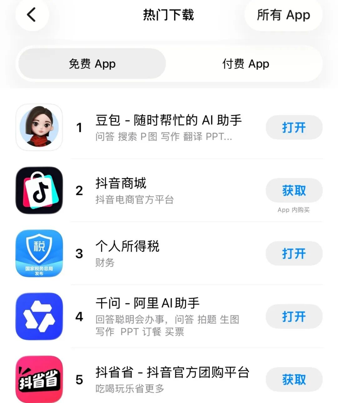 与此同时,今年元宝和豆包携巨资来势汹汹,本质上是对该赛道擂主豆包发起的抢擂攻势。不管最终的日活如何,元宝和千问都先后登上APP Store免费榜TOP1,到底也是风光过。而豆包的稳定日活更像是完成了一次守擂,也成功打出国民心智。