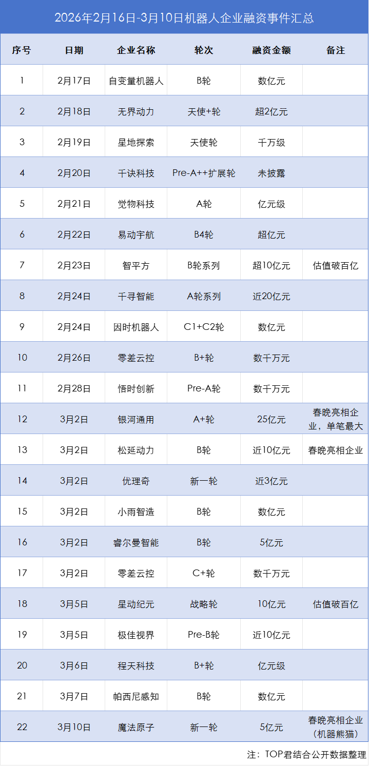 TOP君结合公开信息梳理发现,自2026年春晚至今(2月16日—3月10日),国内具身智能与人形机器人赛道公开融资达22起,披露融资总金额超110亿元(未披露部分未计入),平均每1.1天就有一起融资,资本热度较开年阶段进一步攀升。