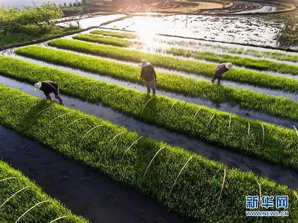 村民在秧田里进行苗床管理资料图:新华网