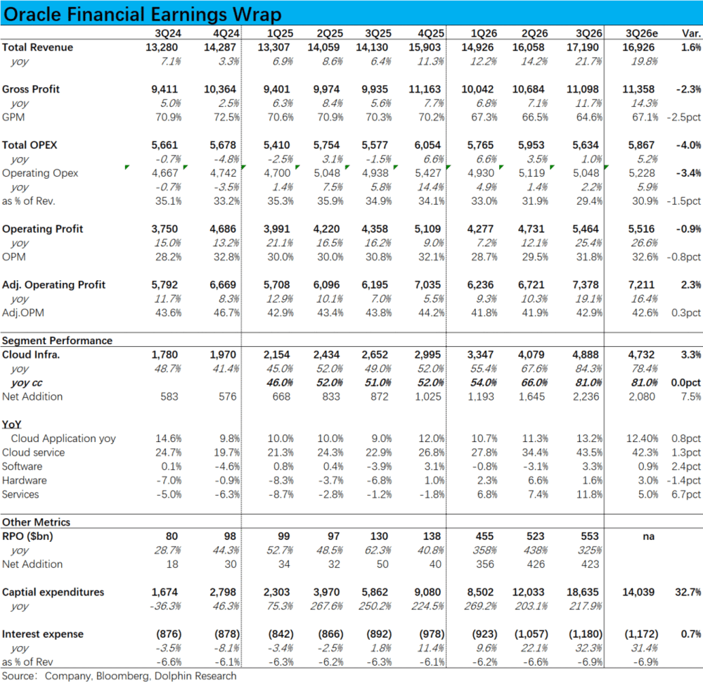 作为4大云巨头中最受争议的甲骨文,今早美股盘后公布了3QF26业绩(截止2月底)。整体来看,当季业绩表现同样是有好有坏,好的是数据库和算力租赁为主的OCI业务增长依然强劲且继续提速;坏的是对毛利率的压制比预期更严重,Capex和借贷规模也超预期快速爬升。