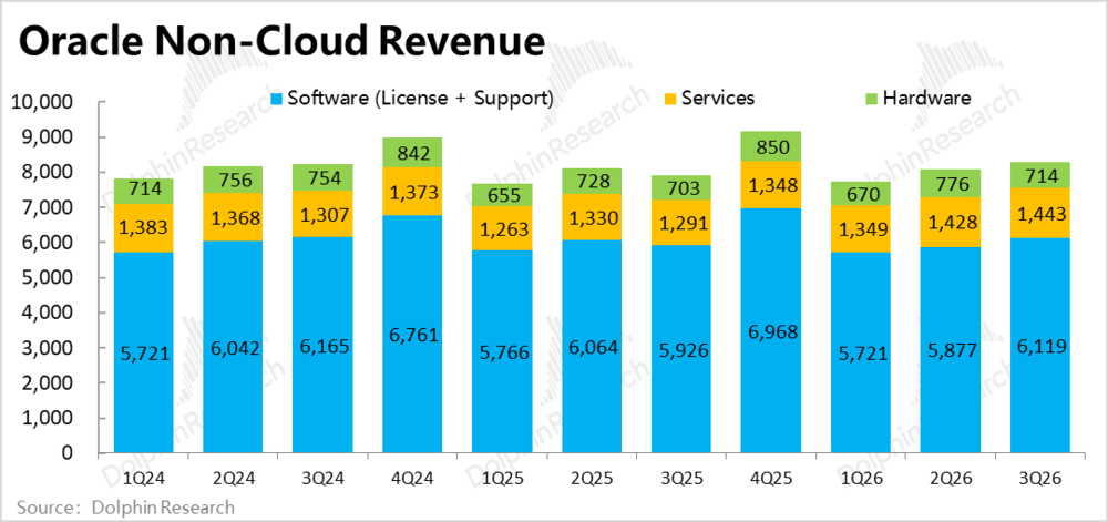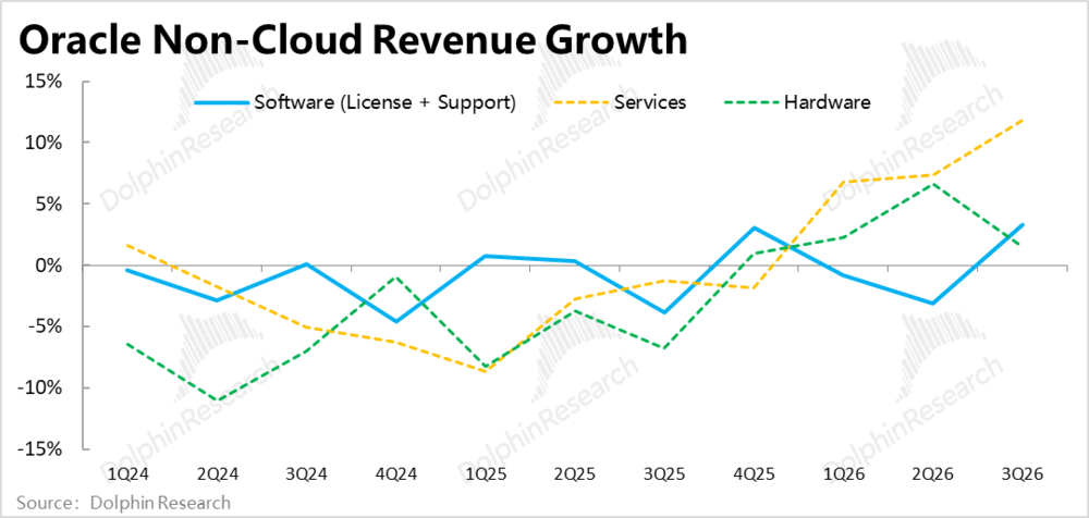 首先大背景是,甲骨文剔除OCI业务--即IaaS云业务外,剩下的所有传统业务都已完全没有成长性,长期营收增速都只徘徊在零上下、好也不过个位数增长。且在当下,和其他软件公司一样,这部分传统业务也存在被AI颠覆的风险。