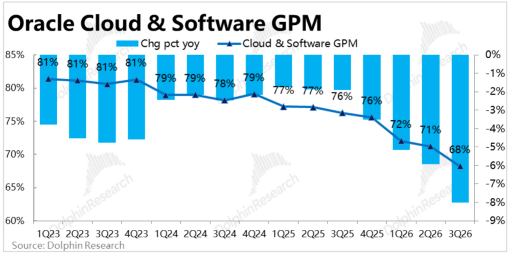 假设软件业务毛利率不变,则云业务整体毛利率可能已跌至50%以下,其中OCI业务的毛利率则可能仅30%上下。