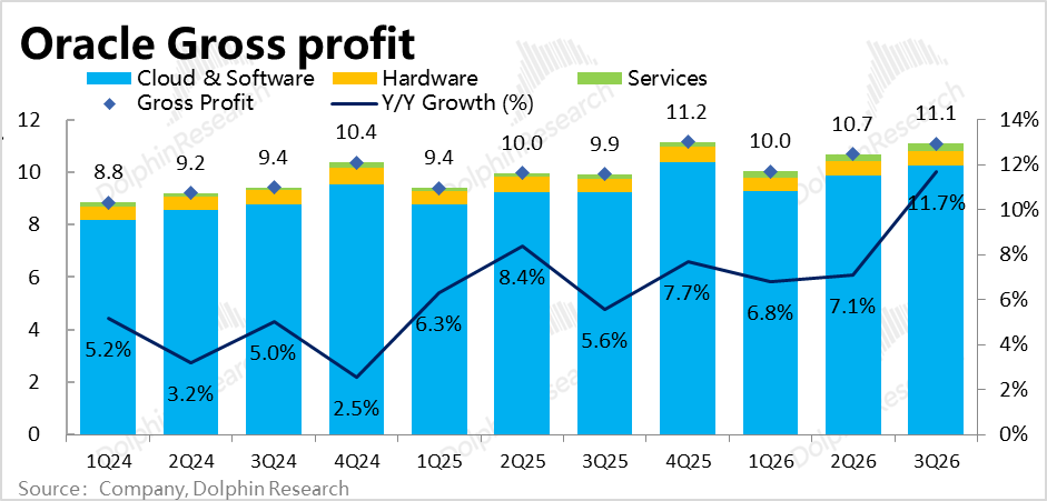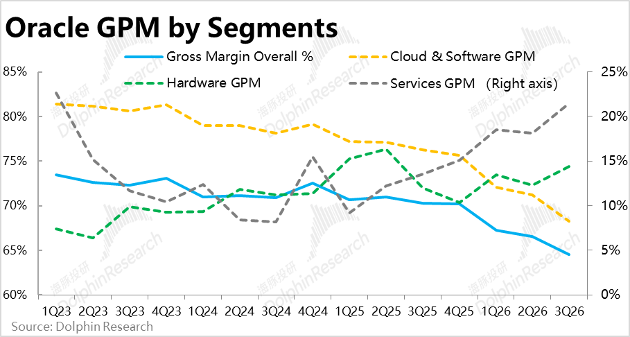 然而除了带来巨大的潜在营收增长外,市场当前核心关注的另两个问题,一个是昂贵的GPU和其他Capex投入下,主要贡献增量的营收的OCI AI相关业务毛利率会显著低于现有业务。因而--另一需重点关注的指标是Cloud&Software板块毛利率的下滑情况,从而从中估算OCI业务的毛利率到底有多低和变化趋势。