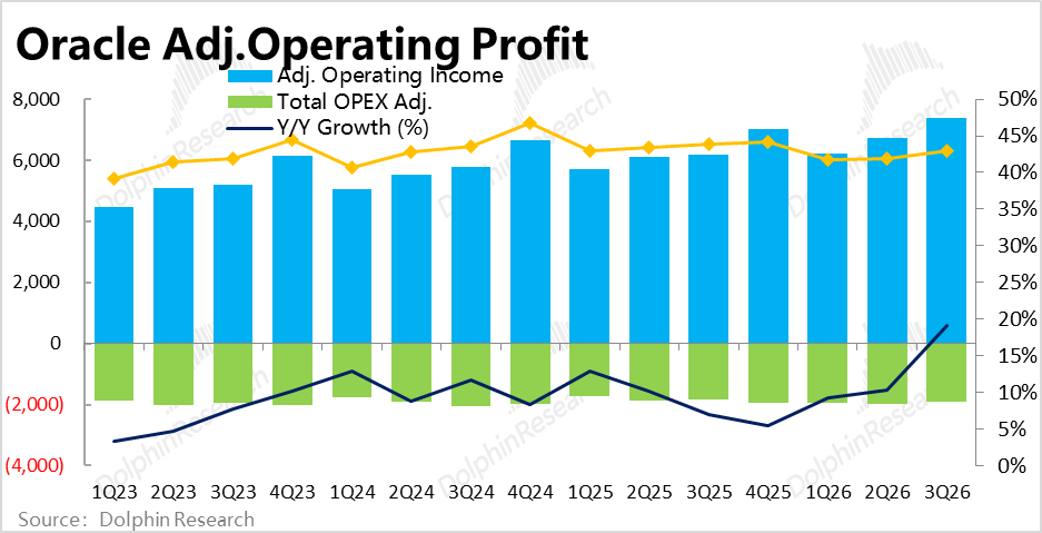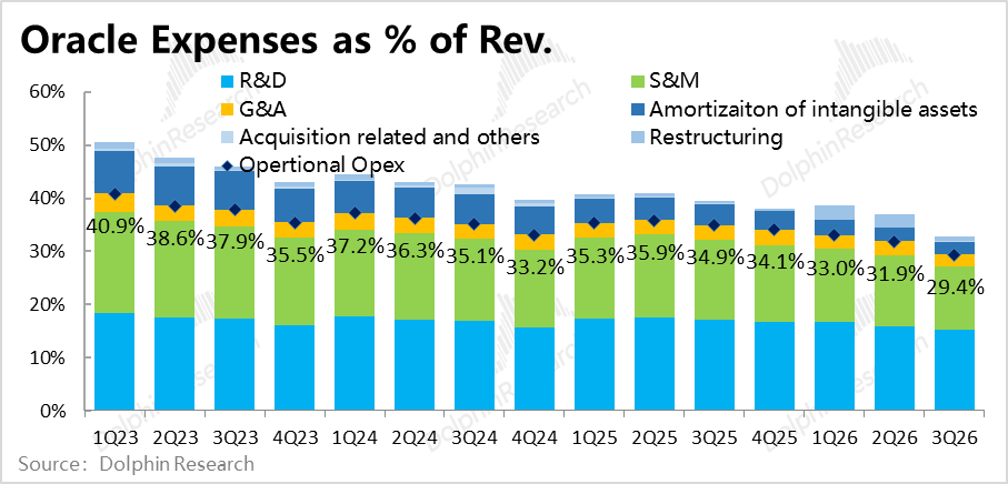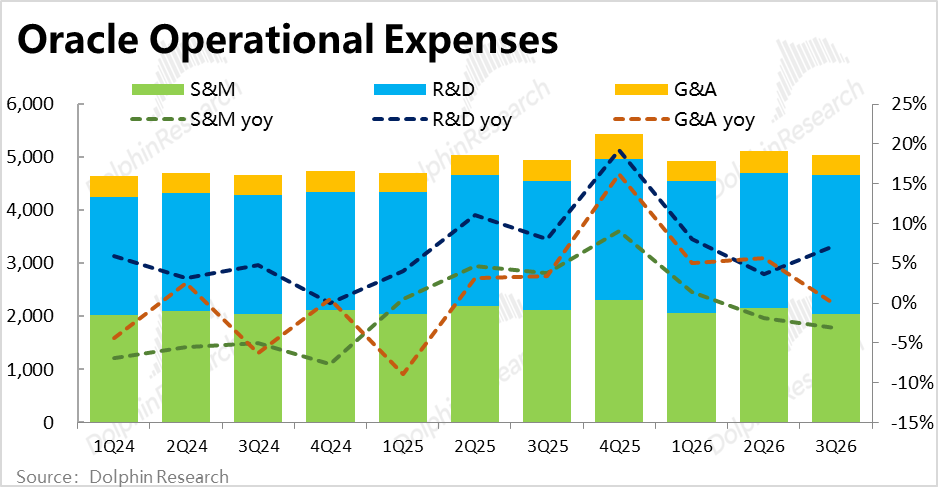 但伴随着OCI的体量加速增长,其对毛利率的拖累也越发明显。本季云+软件业务合计的毛利率(公司不单独拆分披露),本季约68%,同比跌幅达到8pct,比上季的5.9pct进一步扩大,且比市场预期的也更差。