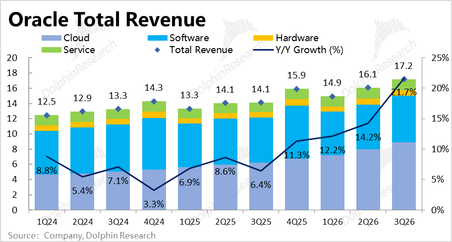 作为一个上世纪80年代就已成立的软件业“老兵”,甲骨文历史上的核心业务主要是数据库和软件服务(传统许可证模式)。但近年来,随着公司的云转型努力以及AI的爆发,云服务已后来居上,成为最重要&最受关注的板块。