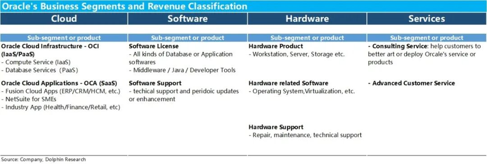 a.云业务:可进一步细分为IaaS类的OCI和SaaS类的OCA两条业务线。其中OCA主要包括SaaS化的ERP/CRM/ERP等通用管理工具,和一些垂类行业工具。而OCI则主要包括公司特色的数据库服务和算力租赁业务。