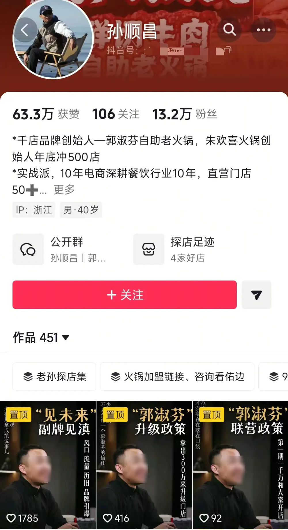 比如郭淑芬火锅的创始人孙顺昌就在抖音运营着创始人IP,专门分享餐饮创业及加盟的内容,吸引了13万人关注,其中不少人都是对该品牌感兴趣的精准人群。