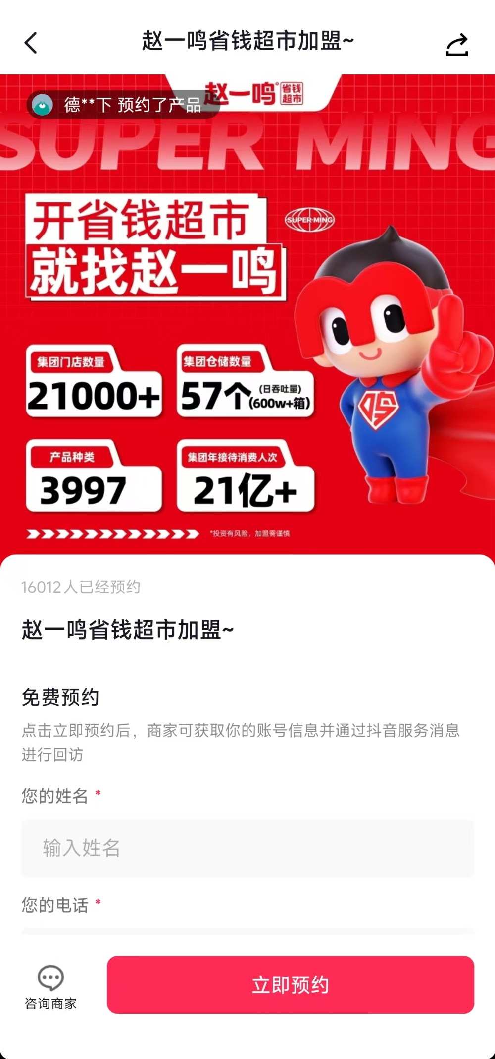 数据显示,赵一鸣在抖音渠道就吸引了16000+个高意向用户主动留资,数千人完成加盟咨询,大量高意向用户通过这套链路成功到店考察,最终推动门店数量实现爆发式增长。