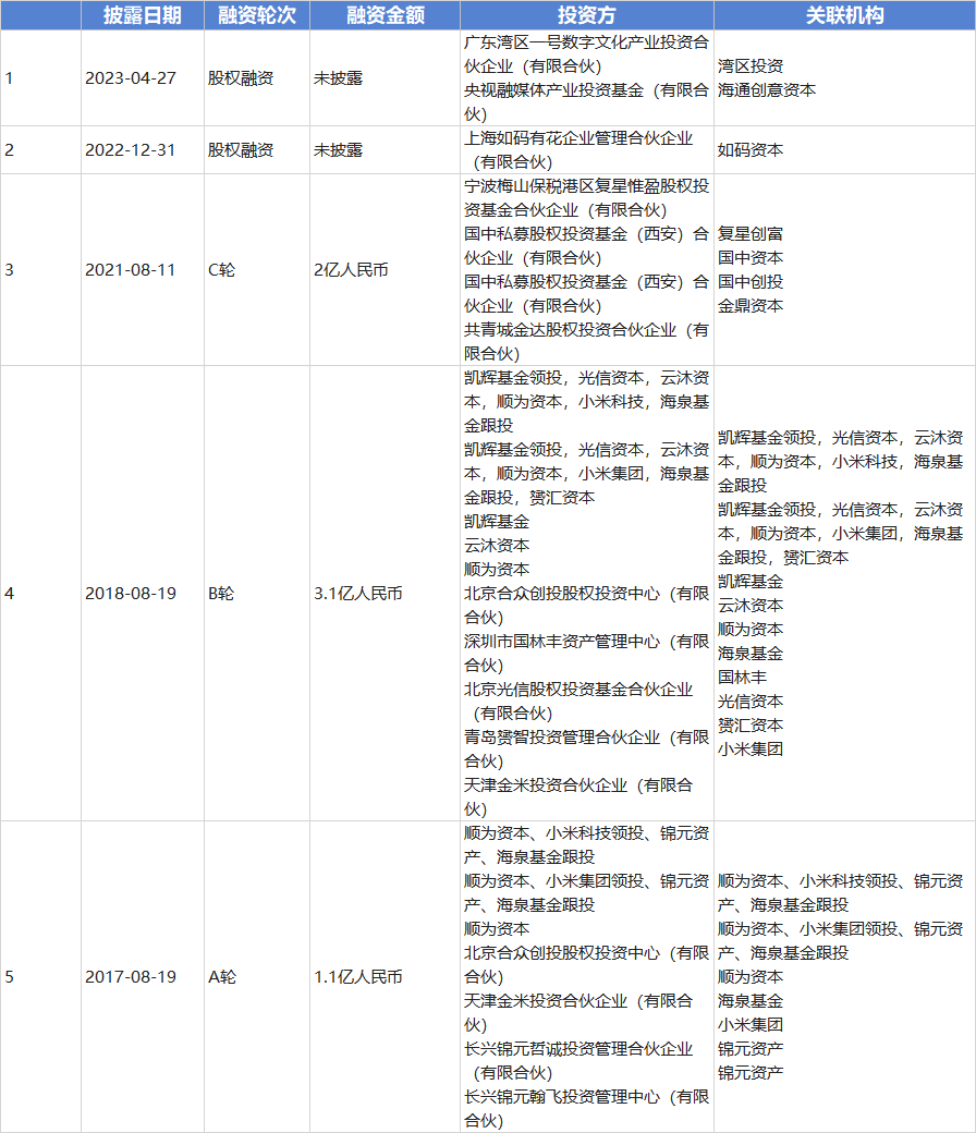 2022年和2023年两轮股权融资并未披露融资金额,投资方则包括了央视基金等。