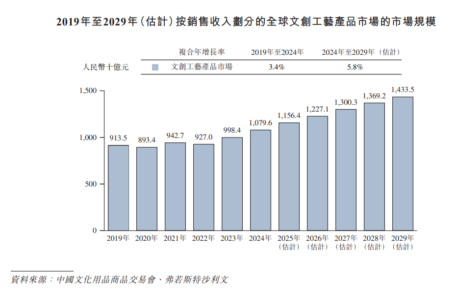 根据弗若斯特沙利文资料,2019年至2024年,中国铜质文创工艺产品整体市场从人民币1,108.2百万元稳步增长至人民币1,576.4百万元。其中,线上销售额快速增长,复合年增长率为8.6%。预计到2029年,线上渠道占总销售额将超过62%,反映了消费者对数字化平台的偏好度持续提升,以及直播和社交电商的日益重要性。