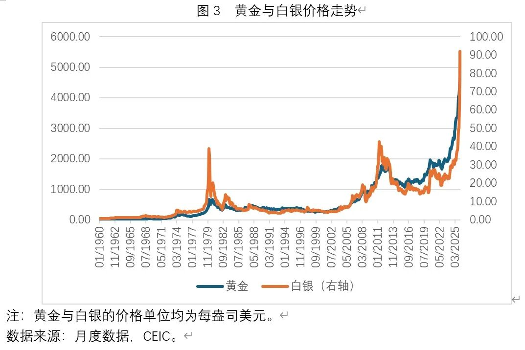 图3展示了1960年1月至2026年2月期间全球黄金价格与白银价格走势。图4展示了同一时期内金银比的变化。从图3中可以看出,第一,历史上白银价格走势与黄金价格走势高度正相关;第二,在金银价格的几个周期性高点时,白银价格的涨跌幅度均显著超过黄金;第三,在价格触顶后,白银价格会先于黄金价格回落。从图4中不难看出,金银比整体上体现出随着时间推移而上升的趋势。例如,金银比在1960年代、1970年代、1980年代、1990年代、2000年代与2010年代的均值分别为28.3、31.6、52.7、73.7、61.5与67.5倍。2020年至2025年,金银比的均值为83.3倍。