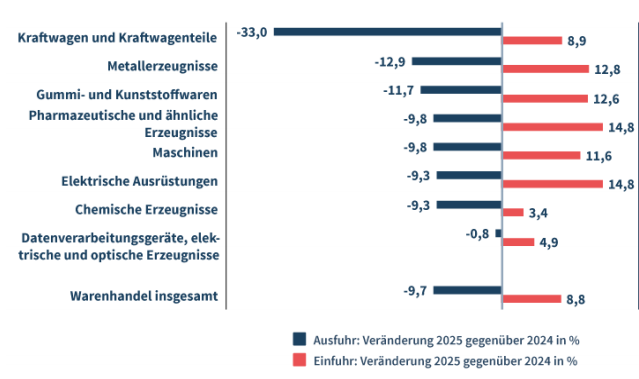 上图德国经济研究所(IW)的报告显示,2025年,德国往中国出口(蓝色)的传统品类如汽车及零配件、金属制品、橡胶及合成材料制品、医药品、机电产品、化学产品同比均下降9%以上,而从中国进口(红色)的同类型产品则逆势增长。