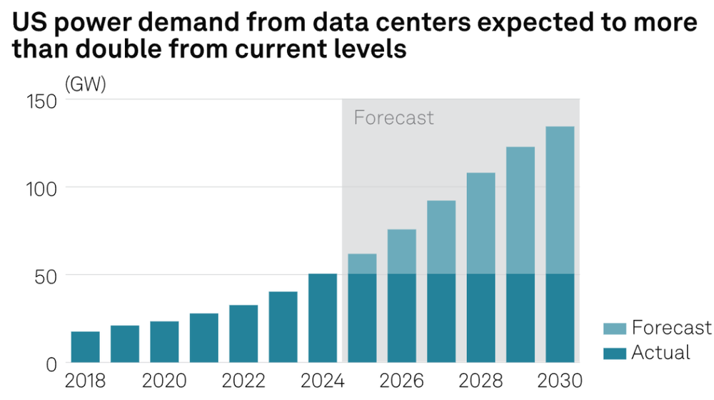 根据标普全球测算,美国数据中心电力需求将在2026年达到75.8吉瓦,并将在2030年提升到134.4吉瓦。
