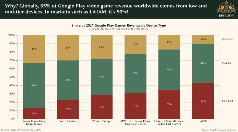 以Google play数据为例,全球65%的收入均来自低配机;在还具有广泛玩家人口红利的拉美市场,低端机型收入贡献则是高达90%。
