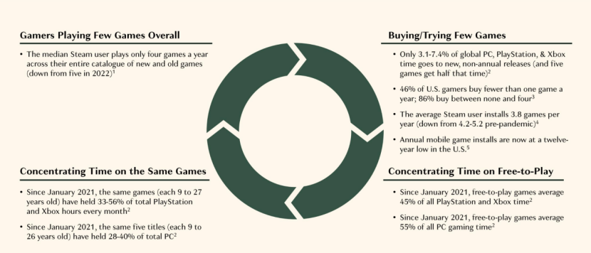 2025年,Steam平台上的用户平均每年只玩4款游戏(2022年:5款);平均下载安装3.8款游戏(疫情前为4.2-5.2款)。