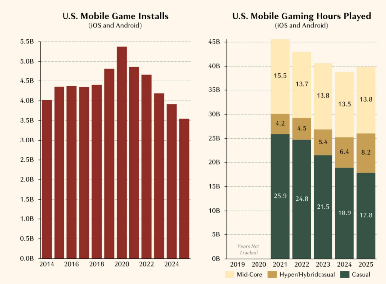 与此同时,全美游戏类应用的装机量创下12年以来的新低;玩家时长没能超越2021年的高峰。