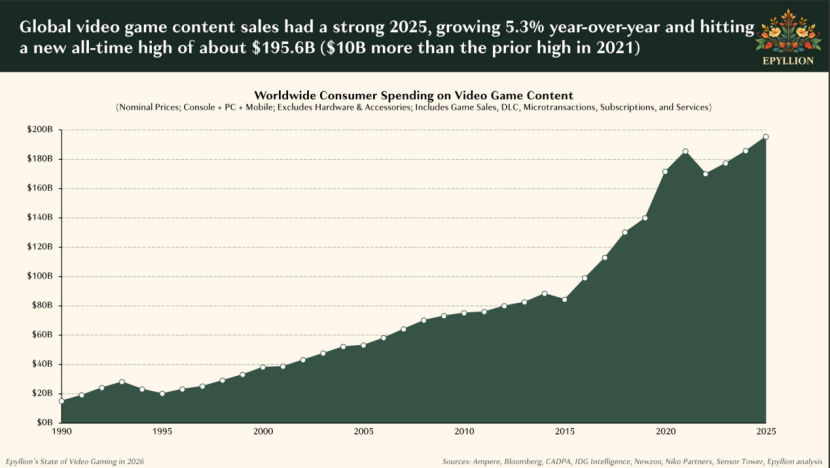 2025年,全球视频游戏市场只增长了5.3%,以100亿美金的增量小幅超越2021年,达到1956亿美金规模。