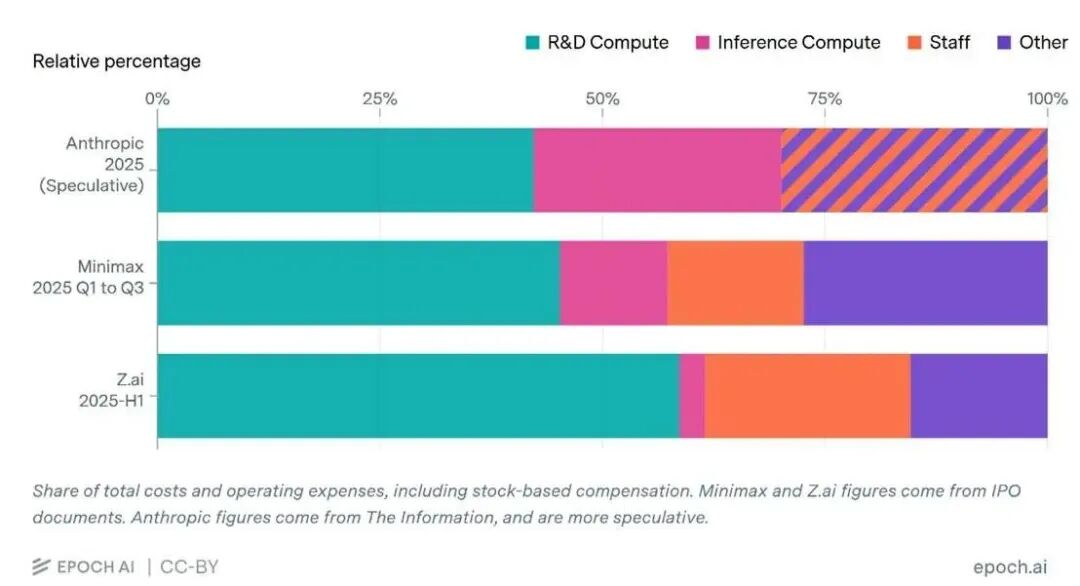 现在,这份来自Anthropic的法律声明表明,现实情况远非如此。公司在模型训练与推理上的累计支出已超过100亿美元,大约是其累计收入的两倍。更重要的是,在大模型厂商的算力支出结构中,无论是美国的闭源前沿模型公司,还是中国的开源模型团队,训练成本始终占据绝对主导地位。这意味着,以Claude系列目前的使用规模来看,几乎不可能仅靠推理收入收回模型训练成本。