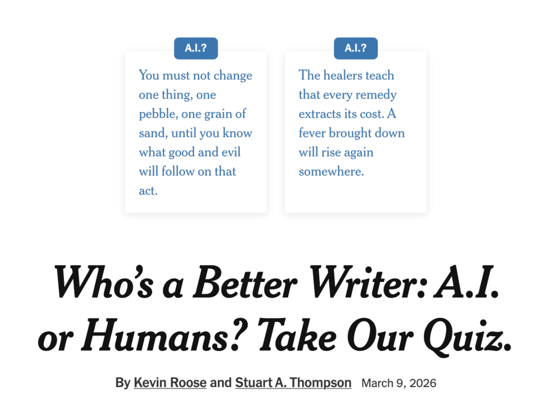 在这份测验中,你将读到五组写作样本,涵盖不同的风格与体裁。我们让AI先选取一篇现有的优秀作品,再用它自己的声音写出一个版本。对于每一组,请选出你更喜欢的那一段。我们会告诉你,有多少其他读者和你意见一致;在测验结束时,你还会看到自己的偏好分布。