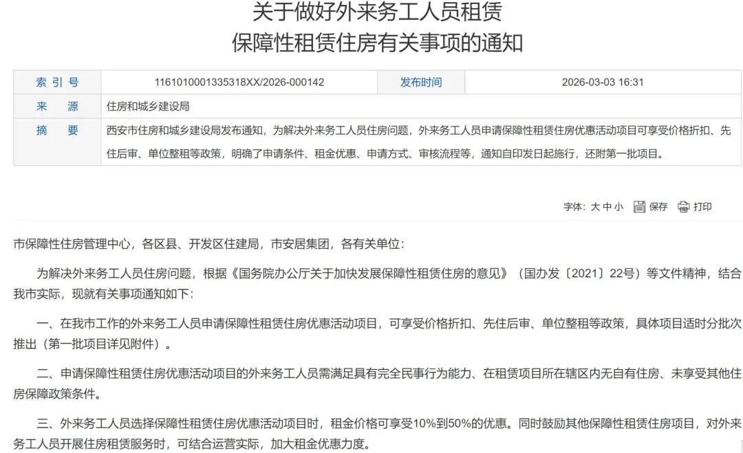 3月初,西安市住建局发布通知,外来务工人员选择保障性租赁住房优惠活动项目时,租金价格可享受10%到50%的优惠;2月初,根据珠海万山海洋开发试验区住建局消息,东澳岛南沙湾片区保障性租赁住房租金按评估租金58元/平方米/月的70%收取,且已于1月1日起实施。