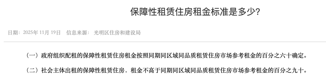再以深圳市光明区为参考,政府组织配租的保租房租金按照同期同区域同品质租赁住房市场参考租金的60%确定;社会主体出租的保租房,租金不高于同期同区域同品质租赁住房市场参考租金的90%。
