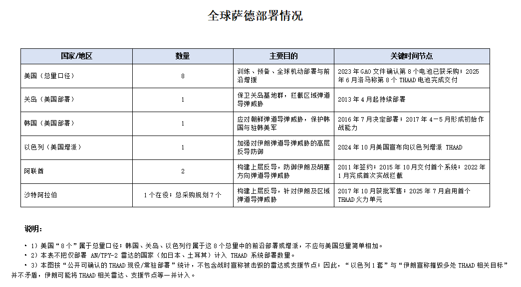 从部署结构看,韩国这套萨德的战略位置也异常敏感。公开可确认的长期或近期重要部署点包括:韩国星州,关岛地区,以及美国于2024年向以色列增派的一套萨德;与此同时,阿联酋拥有2套萨德,沙特在2025年启动了首个萨德单位,但这些海湾国家的系统属于本国用户,不是美国可以像调驻军一样随意腾挪的现成资源。对美国而言,真正可自由调配的,主要还是本土与本军体系内的单位。