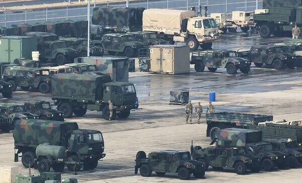 3月9日,韩美联合演习“自由护盾”(FS)启动当天,在京畿道平泽市的汉弗莱斯营,车辆停放在基地内。本次演习将持续至19日,并把近期战争形态中分析出的实战经验等现实威胁纳入演练情景。韩联社