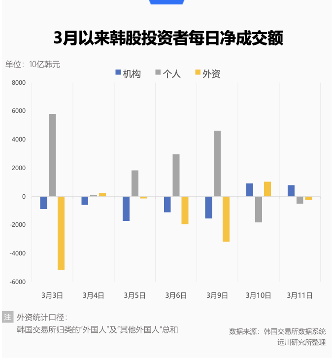 与此同时,韩国交易所的统计还显示了一个有趣的现象。3月以来的行情中,韩国本土散户在净买入,而外资在净卖出,这似乎又在重现2020年疫情风暴时,波动越大,外资越怂,散户越轴的现象。