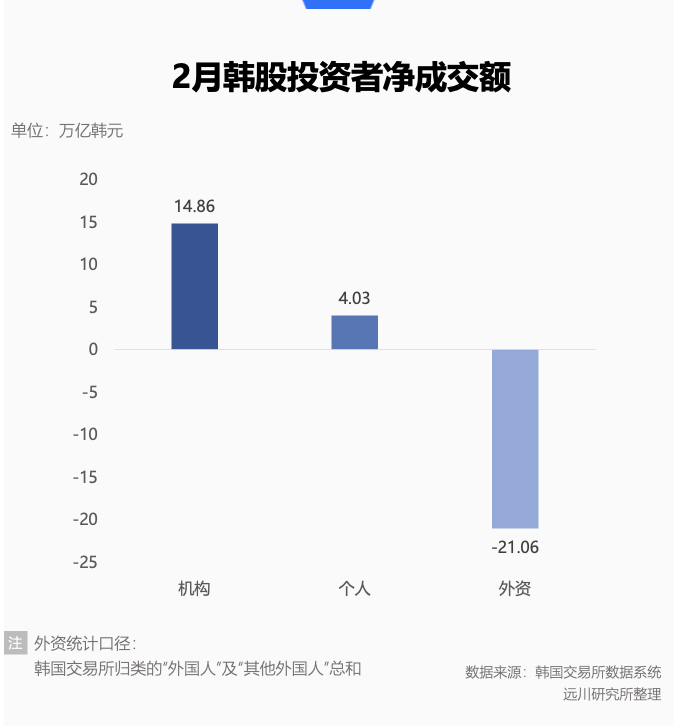 实际上,在本轮“黑天鹅”前夜,韩国本土资金和外资就已经出现分歧。2月韩股的日均成交额达到32.23万亿韩元(约1492亿人民币),环比1月还高出19%,指数和交易量双双创下历史新高。