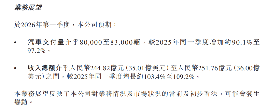 下一个季度的展望,蔚来则表现的有点保守。根据财报指引显示,蔚来2026年一季度的销量给出了8.0-8.3万台的预期。