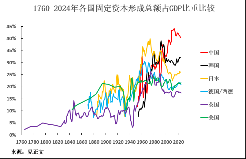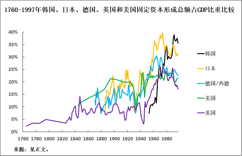 如图1所示,这些依次崛起的领先经济体,其投资占GDP比重均高于前一阶段。这一历史进程始于英国——在工业革命时期,其投资占比约为3%,到19世纪30年代升至约10%;随后是美国,在内战后固定资本形成总额占GDP比重略高于20%;再到二战后的西德,达到30%;接着是日本和韩国,超过35%【2】;而如今,中国的这一比重已略高于40%。