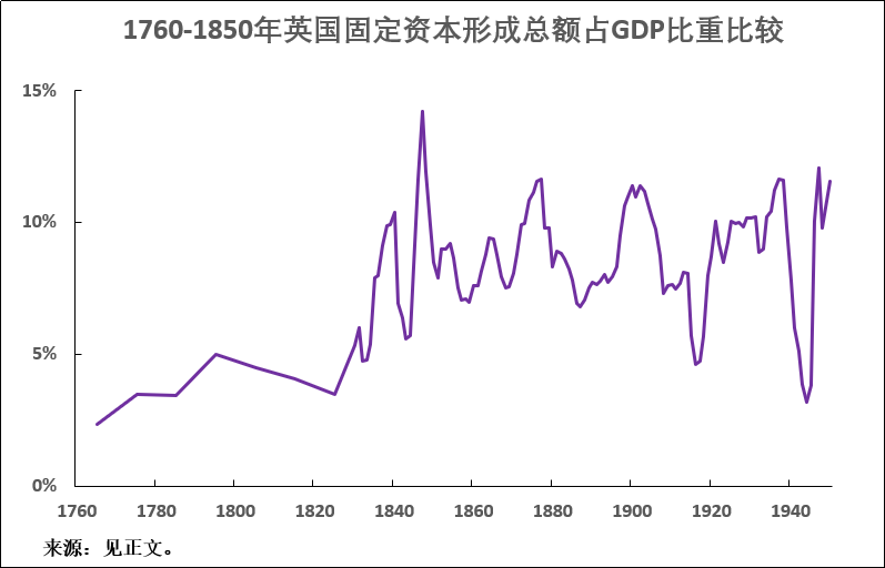 总之,从18世纪60年代到19世纪30年代(基本上涵盖了工业革命时期),按10年移动平均线计算,英国投资占GDP比重从3.3%升至10.5%,GDP年均增速则从1700年的0.6%升至1760年的2.3%。使英国确立了其作为世界领先经济强国的地位。