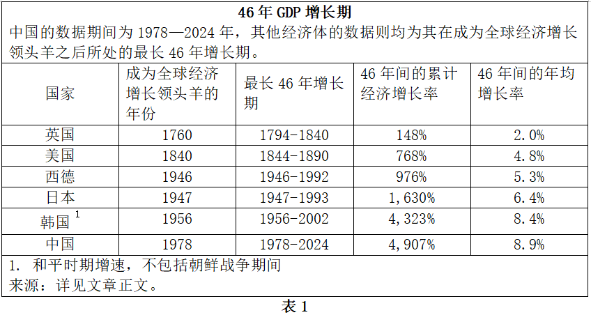 由于对基本的经济发展而言,重要的是可持续的增长率,而非不可持续的短期爆发式增长,因此本文重点关注长期增长率。为了能够与中国自改革开放以来的情况进行精确比较,这里选取的是各国在其成为全球经济增长领头羊期间,持续46年所实现的最大累计经济增长率(相当于中国1978—2024年增长的时间段)。按增长率从高到低排列(同时也按时间由近及远倒序),依次为:中国、韩国、日本、西德、美国,最后是英国。