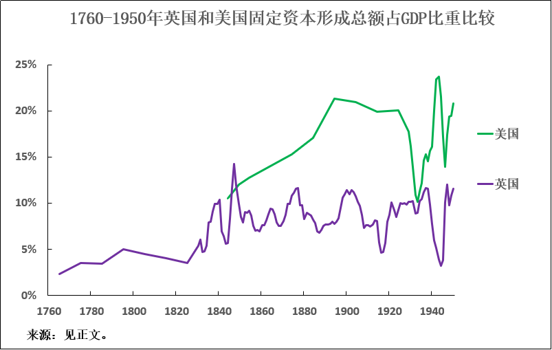 当然,美国在19世纪超越英国,成为全球领先的经济体。与英国相比,美国在投资占GDP比重以及经济增长率这两个方面,都迈上了新的台阶。