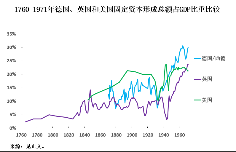 遗憾的是,在英国工业革命爆发期间,美国资本形成总额占GDP比重数据查询不到——仅以现行汇率计价的1839-1848年相关数据可查询得到。而到这一时期,美国的投资水平已然超过英国:固定资本形成总额占GDP比重已达到14%。在19世纪期间,美国固定投资占GDP比重持续大幅上升,最终远远超越英国。