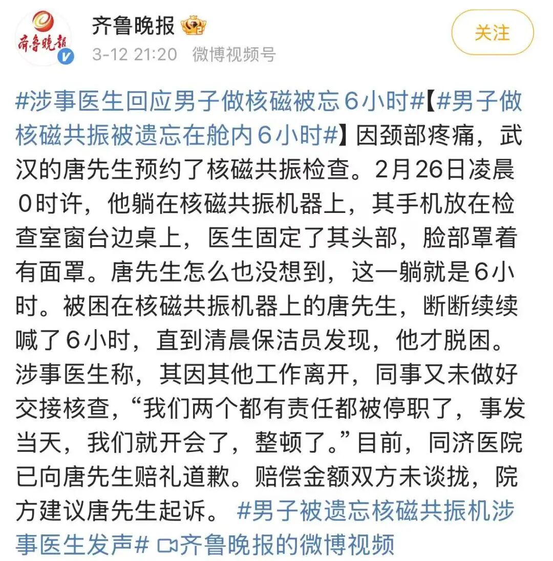 后来涉事的医生回应了,说是把患者“绑”好后,因为急着做其他工作就先走了,在系统里点了“检查完成”,然后口头交代给了同事,结果同事也忘了这茬。