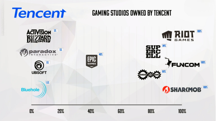 腾讯是全球最大的游戏公司之一,除了在中国运营多家工作室外,它还全资或部分拥有全球数十家游戏公司,包括Riot Games、Funcom、Sumo Group、Turtle Rock Studios、Techland、Supercell、Don't Nod、Epic Games以及育碧。