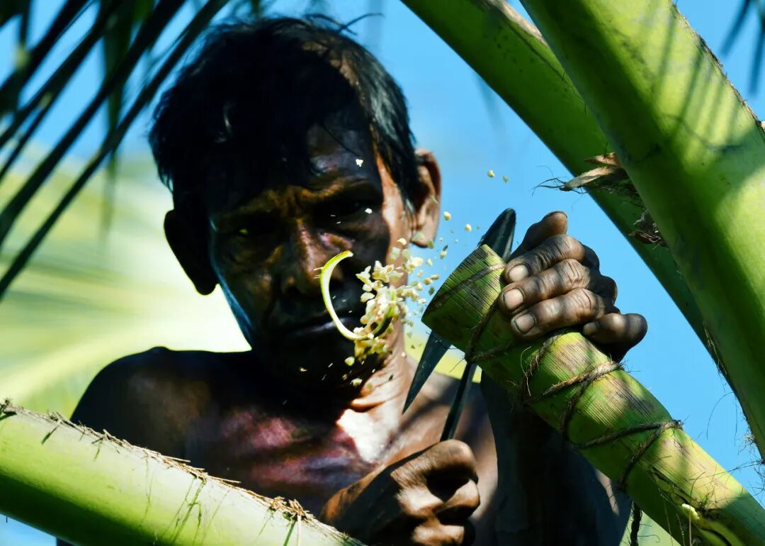 一名工人用刀砍断椰子树的枝叶采集树汁/新华社发(阿吉特·佩雷拉摄)