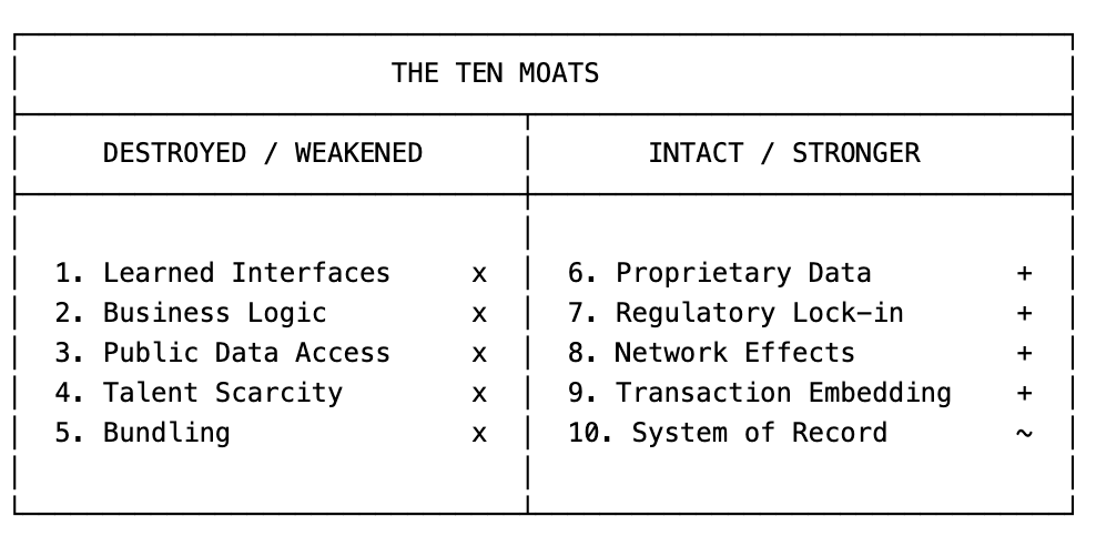 Fintool创始人Nicolas Bustamante在上个月的X长文中提到软件的十大护城河,其中需要学习的界面、工作流、公开数据访问、人才需求性和销售捆绑这五个过去软件的护城河已经被削弱甚至摧毁了。而私有数据、合规管理、网络效应、交易嵌入和记录系统地位这几点,则会巩固地更深。